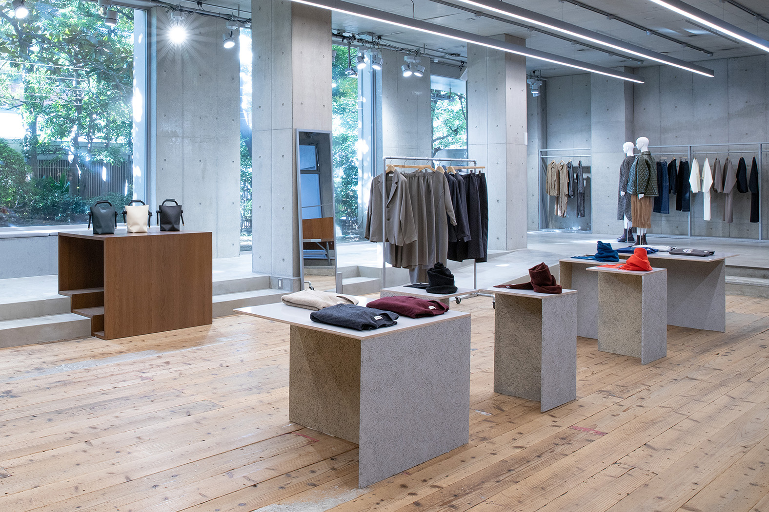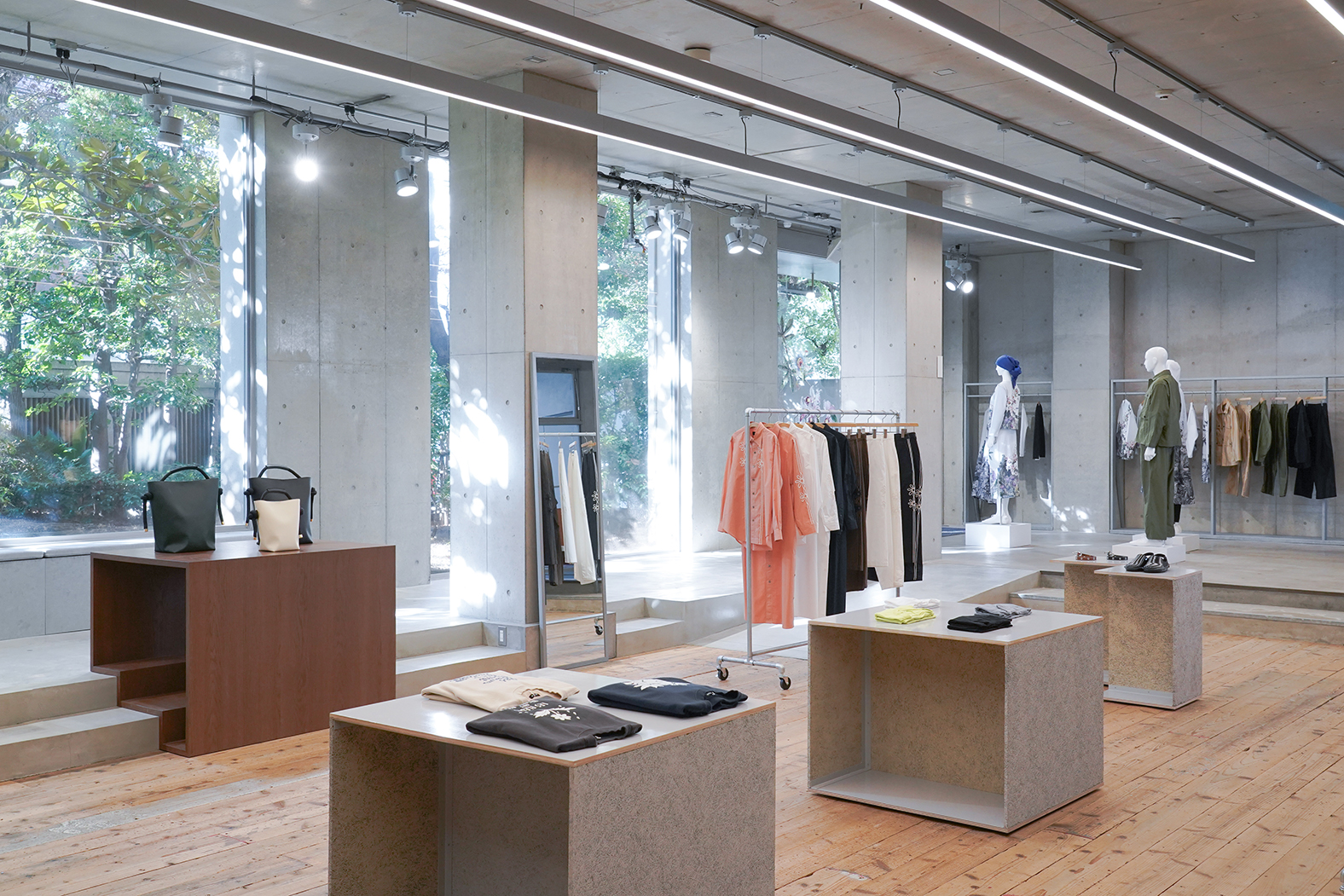 レディス・メンズのアイテムがラインナップされたZUCCaの旗艦店。光が差し込む店内、エントランスには緑が溢れ、ブランドコンセプトにある「着る人にも、見る人にも心地よく」が表現されている、心地よい空間となっています。