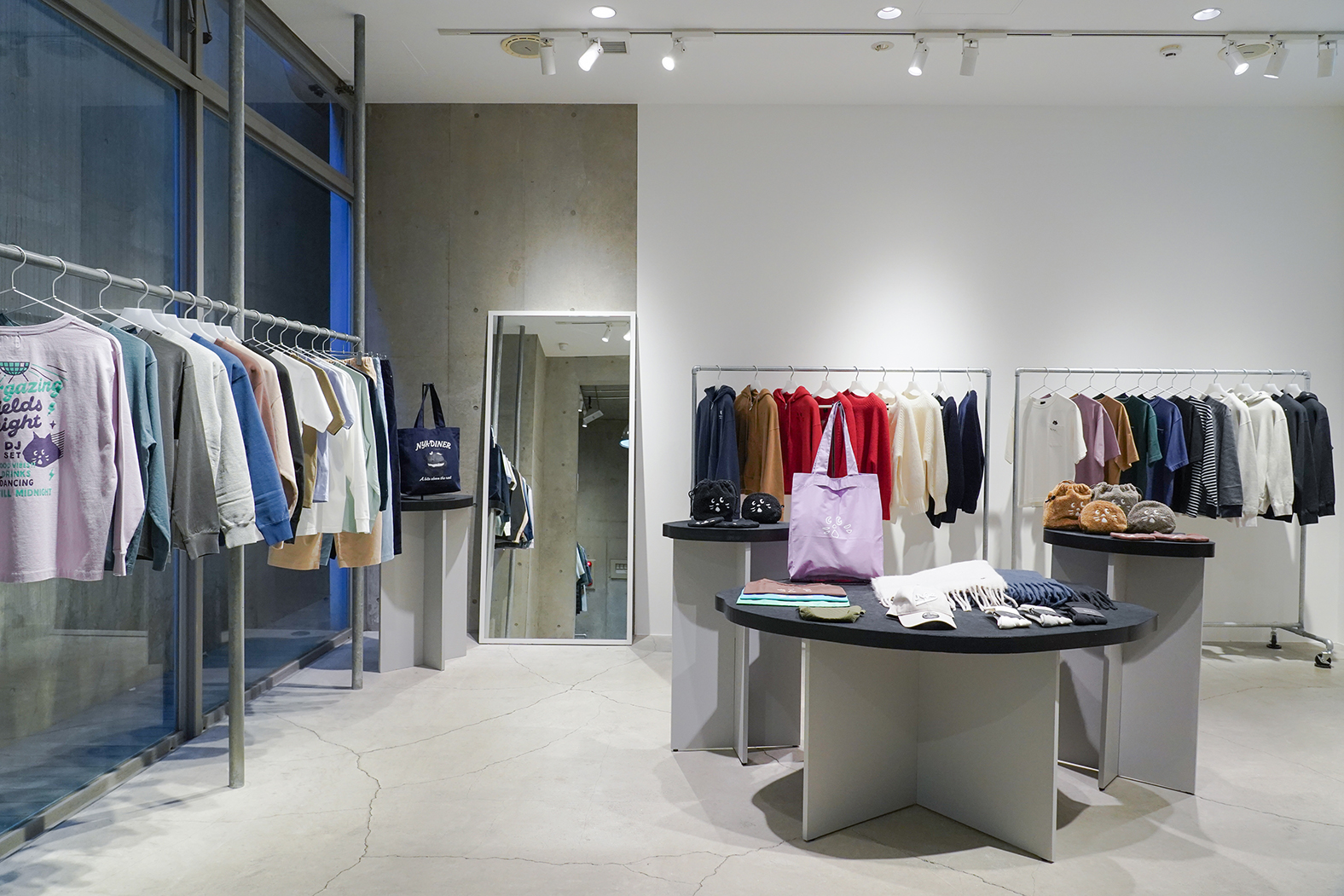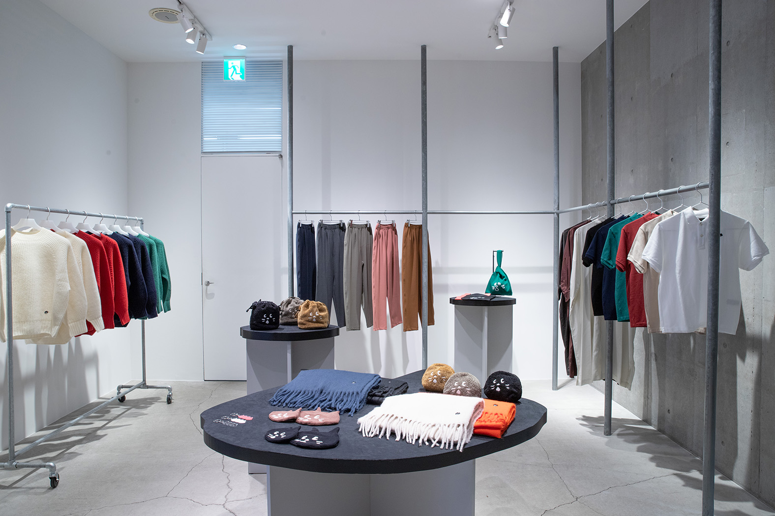 「Be unique, be polite.」をブランドコンセプトにしたNYA-。素材やシルエット、カラーにこだわった上質なプロダクトに、ユニークなねこの顔がそっと遊び心を添えています。白を基調としたミニマルな空間に、NYA-ならではの世界観が広がります。